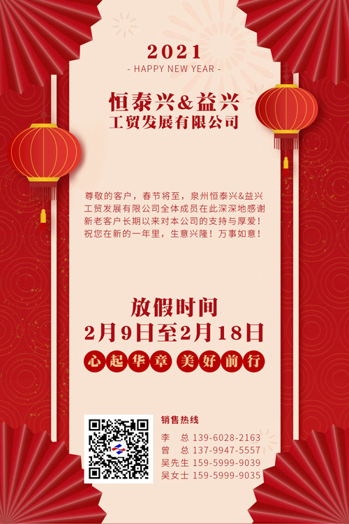 尊敬的客戶,春節(jié)將至,泉州恒泰興&益興工貿(mào)發(fā)展有限公司全體成員在此深深地感謝新老客戶長期以來對本公司的支持與厚愛!祝您在新的一年里,生意興?。∪f事如意!